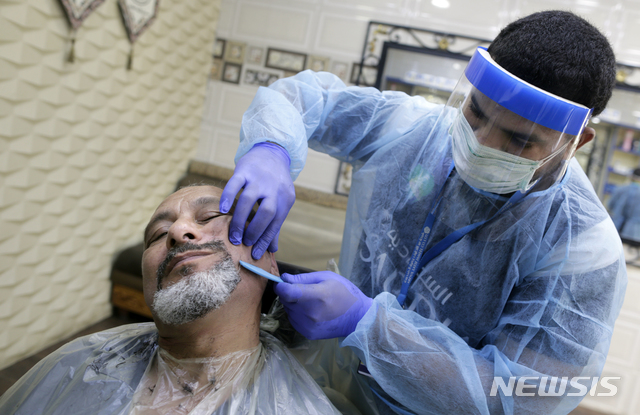 [지다=AP/뉴시스]28일(현지시간) 사우디아라비아 지다에 있는 한 이발소에서 신종 코로나바이러스 감염증(코로나19) 예방을 위해 마스크와 보호 장구를 착용한 이발사가 손님을 면도하고 있다. 2020.06.29.