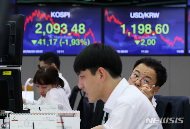 [서울=뉴시스]전신 기자 = 코스피는 41.17포인트 내린 2093.48로, 원·달러 환율은 2.0원 내린 1198.6원으로 장을 마감한 29일 서울 중구 하나은행 딜링룸에서 직원들이 업무를 보고 있다. 2020.06.29.