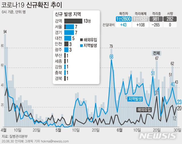 [서울=뉴시스]30일 오전0시 기준 코로나19 신규 확진환자가 43명이 발생했다. 신규 확진환자 중 23명은 지역발생, 20명은 해외유입이다. (그래픽=안지혜 기자)