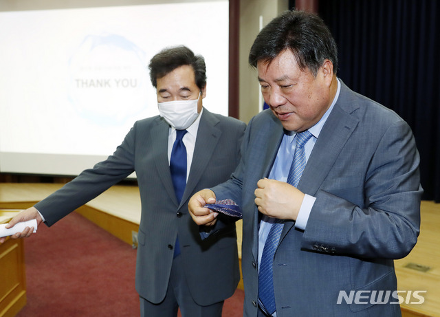 [서울=뉴시스] 최동준 기자 = 서정진 셀트리온 회장이 30일 서울 여의도 국회의원회관에서 열린 포스트 코로나19 대응 제안 포럼에서 강연한 후 이낙연 더불어민주당 의원과 이동하고 있다. 2020.06.30.