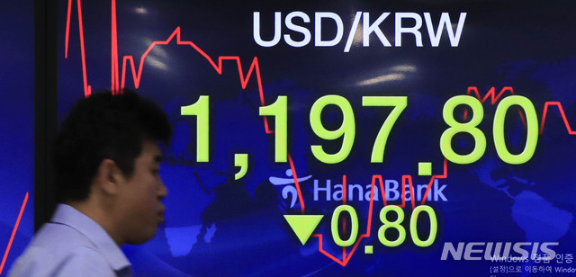 [서울=뉴시스] 박민석 기자 = 30일 서울 외환시장에서 원·달러 환율은 전 거래일(1198.6원)보다 0.1원 내린 1198.5원에 출발했다. 30일 오전 서울 중구 하나은행 딜링룸 전광판에 원·달러 환율이 전 거래일보다 0.80원 내린 1197.80원을 나타내고 있다. 이날 코스닥 지수는 전 거래일(734.69)보다 9.85포인트(1.34%) 오른 744.54에, 서울 외환시장에서 원·달러 환율은 전 거래일(1198.6원)보다 0.1원 내린 1198.5원에 출발했다. 2020.06.30.