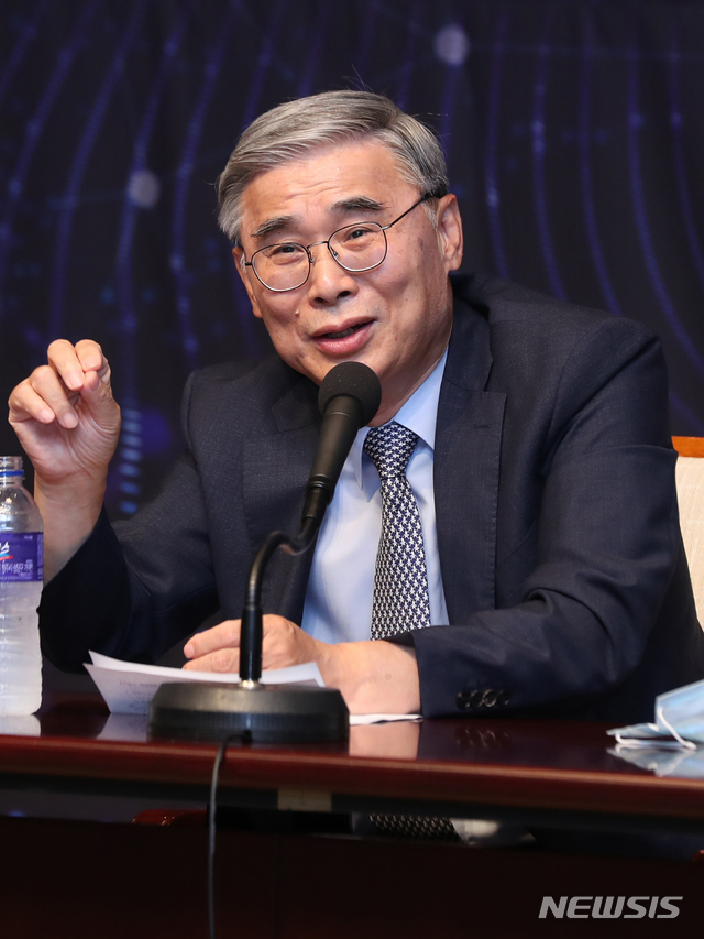 [서울=뉴시스] 이윤청 기자 = 이종석 전 통일부 장관이 1일 서울 중구 프레스센터 국제회의장에서 열린 KPF 포럼 '격동의 한반도, 문정인·이종석 대담'에서 발언하고 있다. 2020.07.01.