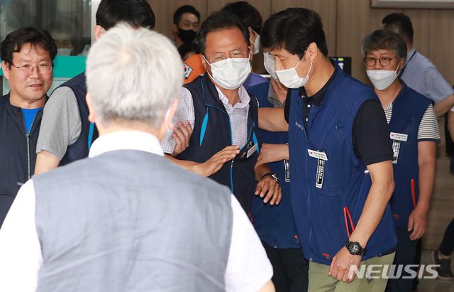 [서울=뉴시스] 이영환 기자 = 김명환 민주노총 위원장이 1일 오후 서울 중구 민주노총에서 부축을 받으며 구급차로 향하고 있다. 2020.07.01. [email protected]