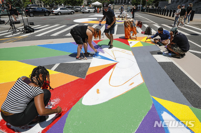 [뉴욕=AP/뉴시스]2일(현지시간) 미국 뉴욕 맨해튼 자치구의 폴리 광장에서 시민들이 "흑인 생명도 소중해"(Black Lives Matter)라는 대형 그림을 그리고 있다. 2020.07.03.