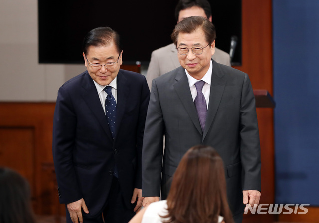 [서울=뉴시스]박영태 기자 = 정의용 국가안보실장과 국가안보실장에 내정된 서훈 국정원장이 3일 오후 청와대 대브리핑룸에서 이임사를 한 후 단상을 내려오고 있다. 2020.07.03.