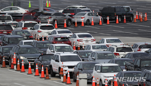 [마이애미가든스=AP/뉴시스]5일(현지시간) 미 플로리다주 마이애미 가든스의 하드록 스타디움 밖에 있는 신종 코로나바이러스 감염증(코로나19) 차량 탑승 검사장에서 차량이 검사 순서를 기다리고 있다. 플로리다주 보건당국은 주 내 코로나19 발생 이래 20만 명 넘는 사람이 코로나19 확진 판정을 받아 암울한 기록을 세웠다고 밝혔다. 플로리다주의 누적 확진자 수는 20만111명, 사망자는 3732명으로 집계됐다. 2020.07.06.
