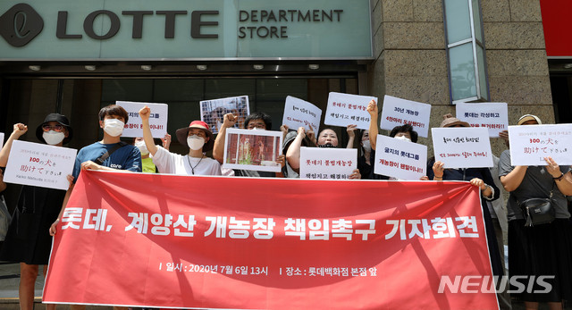 [서울=뉴시스]추상철 기자 =계양산 개농장 해결을 촉구하는 시민동물활동가들이 6일 오후 서울 중구 롯데백화점 본점 앞에서 '롯데 재벌가 소유의 계양산 땅에 불법 개농장이 있다'며 책임을 촉구하는 기자회견을 하고 있다. 2020.07.06.