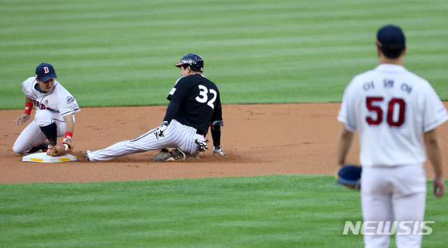[서울=뉴시스]홍효식 기자 = 7일 오후 서울 잠실야구장에서 열린 '2020 신한은행 SOL KBO리그' 두산 베어스와 LG 트윈스의 경기, 1회초 무사 주자없는 상황에서 LG 이천웅이 타격 후 2루에서 아웃 당하고 있다. 2020.07.07.