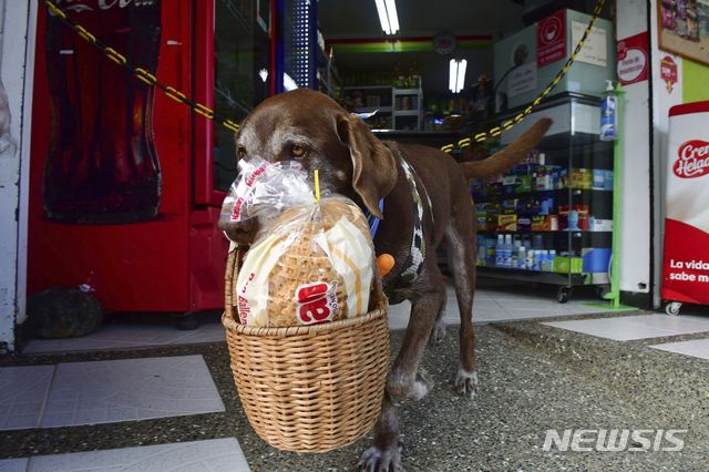 [메데진=AP/뉴시스]올해 여덟 살의 래브라도레트리버 '에로스'가 7일(현지시간) 콜롬비아 메데진의 한 미니 마켓에서 빵 바구니를 물고 배달에 나서고 있다. '에로스'는 이전에 그에게 간식으로 보상을 해준 고객들의 이름을 기억해 약간의 훈련을 거쳐 그들의 집까지 가는 법을 배워 가벼운 배달을 하고 있다. 에로스의 주인 마리아 보테로는 "에로스가 코로나19로 인한 사회적 거리 두기에 도움을 준다"라고 밝혔다. 2020.07.08.