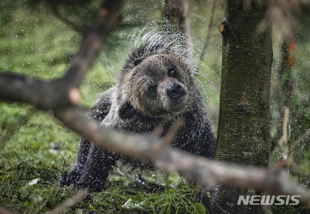 [밴쿠버=AP/뉴시스]8일(현지시간) 캐나다 브리티시컬럼비아주 앨더그로브의 밴쿠버 동물원에서 새끼 회색곰 한 마리가 몸에 묻은 물을 털어내고 있다. 동물원 측은 세 마리 새끼 곰의 어미가 앨버타에서 사냥꾼의 총에 맞아 죽으면서 이들을 동물원으로 데려왔다고 밝혔다. 2020.07.09.