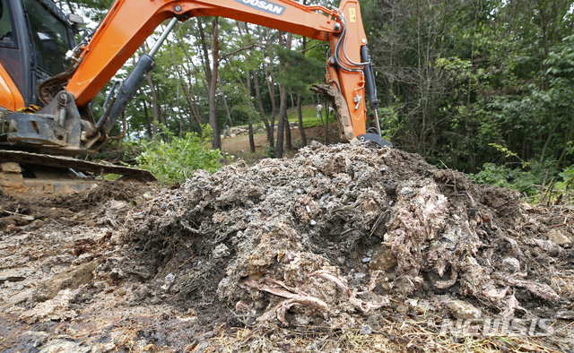 [임실=뉴시스] 김얼 기자 = 임실군청 청소위생과 직원들이 9일 전북 임실군 덕치면에 위치한 임야에서 폐기물 중간 처리업자가 무단으로 버린 장어 사체를 치우고 있다. 2020.07.09.