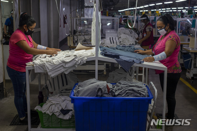 [산미겔페타파=AP/뉴시스]10일(현지시간) 과테말라 산 미겔 페타파에 있는 한국 의류업체 'KP 텍스타일' 검사실에서 마스크를 쓴 직원들이 제품 검사를 하고 있다. 이 업체는 직원 10여 명이 코로나19 확진 판정을 받아 한 달 이상 폐쇄됐다가 새로운 안전 수칙을 시행하면서 조업을 재개했다. 2020.07.11.