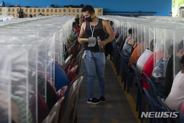 [산미겔페타파=AP/뉴시스]10일(현지시간) 과테말라 산 미겔 페타파에 있는 한국 의류업체 'KP 텍스타일' 식당에서 근로자들이 코로나19 확산 방지를 위해 플라스틱으로 분리된 식탁에서 점심을 먹고 있다. 이 업체는 직원 10여 명이 코로나19 확진 판정을 받아 한 달 이상 폐쇄됐다가 새로운 안전 수칙을 시행하면서 조업을 재개했다. 2020.07.11.