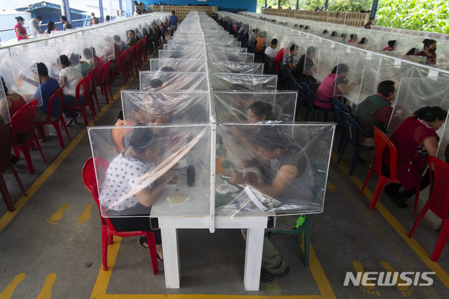 [산미겔페타파=AP/뉴시스]10일(현지시간) 과테말라 산 미겔 페타파에 있는 한국 의류업체 'KP 텍스타일' 식당에서 근로자들이 코로나19 확산 방지를 위해 플라스틱으로 분리된 식탁에서 점심을 먹고 있다. 이 업체는 직원 10여 명이 코로나19 확진 판정을 받아 한 달 이상 폐쇄됐다가 새로운 안전 수칙을 시행하면서 조업을 재개했다. 2020.07.11.