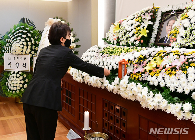 [서울=뉴시스]최진석 기자 = 김현미 국토교통부 장관이 11일 종로구 서울대병원 장례식장에 차려진 고 박원순 서울시장의 빈소를 찾아 조문하고 있다. (사진=서울시 제공) 2020.07.11.