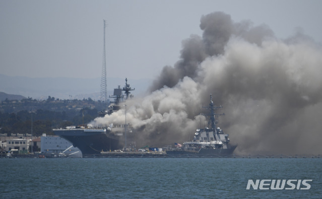 [샌디에이고=AP/뉴시스]12일(현지시간) 미 캘리포니아주 샌디에이고 해군기지에 정박 중이던 미해군 전함(USS) 본험 리처드 호가 폭발에 이은 화재로 연기에 싸여 있다. 이 사고로 18명이 다쳐 병원으로 후송됐으며 당시 함정에는 160여 명이 승선하고 있던 것으로 알려졌다. 2020.07.13.