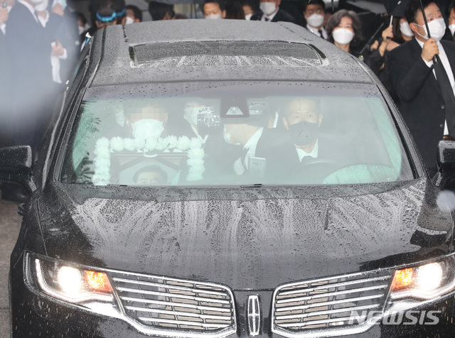 [서울=뉴시스]전진환 기자 = 13일 오전 고(故) 박원순 서울시장의 발인식이 엄수된 서울 종로구 서울대학교병원 장례식장에서 고인의 영정과 유해가 실린 운구차가 나오고 있다. 2020.07.13.