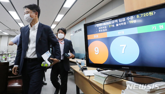 [세종=뉴시스]강종민 기자 = 박준식 최저임금위원장이 14일 새벽 정부세종청사 고용노동부에서 열린 제9차 최저임금위원회 전원회의를 마친 뒤 회의장을 나서고 있다. 이날 전원회의에서는 민노총과 한노총 근로자위원들의 집단 퇴장으로 공익위원들이 낸 안으로 표결에 부쳐졌으며 찬성 9표, 반대 7표로 2021년도 최저임금은 시급 기준 8720원으로 최종 의결됐다. 2020.07.14.