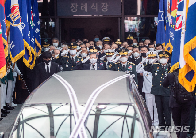 [서울=뉴시스]사진공동취재단 = 15일 오전 서울 송파구 서울아산병원 장례식장에서 고 백선엽 장군의 영결식이 끝나고 정경두 국방부, 서욱 육군참모총장 등이 운구차량을 향해 거수경례를 하고 있다. 2020.07.15.
