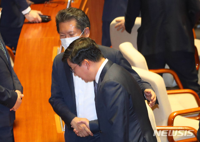 [서울=뉴시스] 장세영 기자 = 정보위원장으로 선출된 전해철 더불어민주당 의원이 16일 서울 여의도 국회에서 열린 본회의에서 정청래 더불어민주당 의원과 인사를 나누고 있다. 2020.07.16.