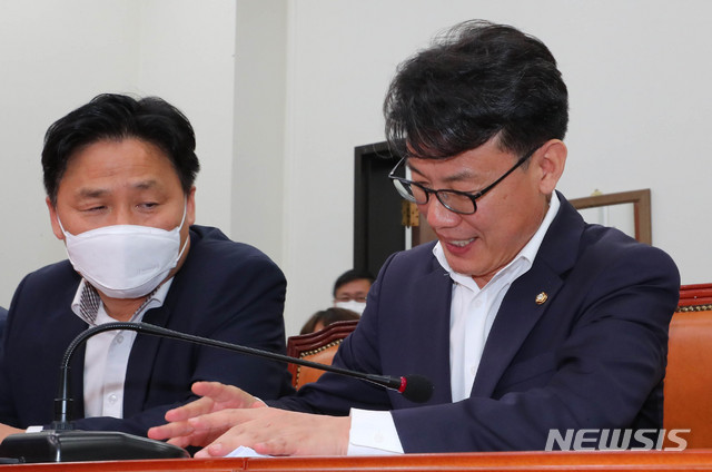 [서울=뉴시스] 장세영 기자 = "집값이 안 떨어질 거다"라고 발언을 해 논란을 빚은 진성준 더불어민주당 의원이 17일 서울 여의도 국회에서 열린 더불어민주당 최고위원회의에 참석해 고개를 숙이고 있다. 2020.07.17.