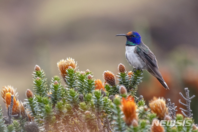 [애틀랜타=AP/뉴시스]17일(현지시간) 미 조지아주 애틀랜타의 조지아 주립대가 발표한 연구 결과, 벌새가 다른 새들의 범위를 넘는 주파수로 노래하고 들을 수 있는 것으로 나타났다. 수컷 벌새의 구애 노래는 약 13.4KHz로 이는 새에게는 초음파에 해당하며 일반적으로 새들은 9~10KHz를 넘으면 듣지 못하는 것으로 알려져 있다. 벌새는 바람 부는 산악 환경에서 유별나게 높은 음조의 지저귐으로 주변 소음보다 더 높은 소리를 내 종족이 듣게 한다. 사진은 파올로 에스코바르가 제공한 2019년 사진으로 에콰도르에서 촬영한 수컷 벌새의 모습. 2020.07.18.