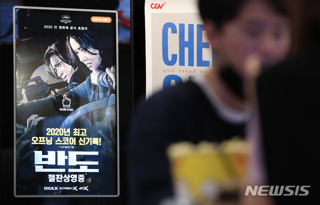 [서울=뉴시스] 박민석 기자 = 신종 코로나바이러스 감염증(코로나19) 사태 장기화로 문화예술시장 소비가 얼어붙은 가운데 연상호 감독의 액션 블록버스터 영화 '반도'가 개봉 나흘 만인 지난 18일 100만 관객을 돌파했다. 사진은 19일 서울 시내의 한 영화관에 설치된 무인 매표기에 나오는 영화 반도 포스터의 모습. 2020.07.19.
