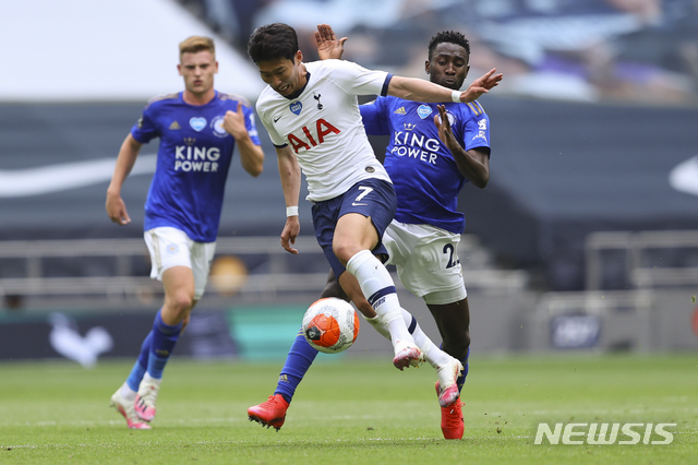 [런던=AP/뉴시스]손흥민이 19일(현지시간) 영국 런던의 토트넘 홋스퍼 스타디움에서 열린 레스터시티와의 2019-20시즌 잉글랜드 프리미어리그(EPL) 37라운드 레스터시티와의 홈경기에 선발 출전해 공을 다투고 있다. 손흥민은 전반 6분 상대 제임스 저스틴의 몸에 맞고 굴절되는 선제골을 넣었으나 이는 저스틴의 자책골로 기록됐다. 토트넘은 이후 해리 케인의 2골을 넣어 레스터시티에 3-0으로 승리했고 손흥민은 경기 후 열린 토트넘 자제 시상식에서 '올해의 선수'와 '올해의 골' 등에 선정됐다. 2020.07.20.