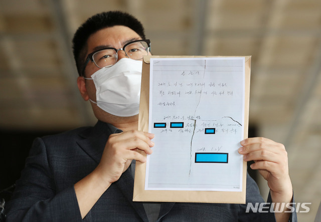 [서울=뉴시스] 박미소 기자 = 양태정 변호사가 탈북여성 장기간 성폭행한 현직 경찰 간부를 강간과 유사강간 및 업무상 위력에 의한 간음 등의 혐의로 고소하기 위해 고소장을 제출하기 전 28일 오후 서울 서초구 서울중앙지방검찰청 앞에서 증거 자료를 제시하고 있다.2020.07.28.
