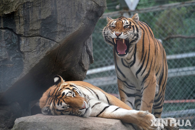 [하이린=신화/뉴시스]국제 호랑이의 날인 29일(현지시간) 중국 헤이룽장성 북동부 하이린의 시베리아 호랑이 공원에 시베리아 호랑이 두 마리가 휴식을 취하고 있다. 2020.07.29.