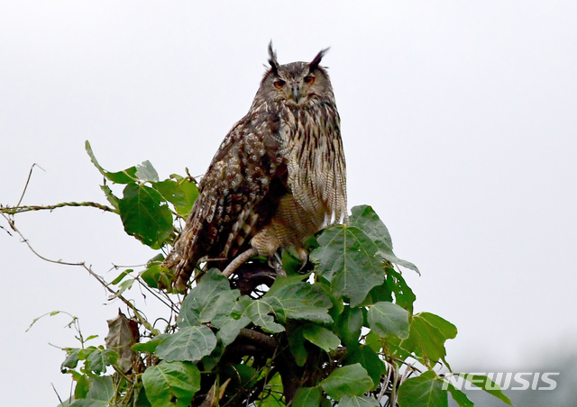 [남해=뉴시스]차용현 기자 = 지난 28일 오후 천연기념물 제324호이자 멸종위기 야생생물 2급으로 지정돼 보호받고 있는 수리부엉이가 경남 남해군 망운산 산기슭에서 나무꼭대기에 앉아 휴식을 취하고 있다. 2020.07.29.