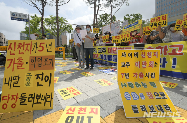 [수원=뉴시스]홍효식 기자 = 이만희 신천지예수교 증거장막성전 총회장의 영장실질심사일인 31일 오전 경기 수원시 영통구 수원지방법원 앞에서 전국신천지피해자연대가 이만희 교주 구속수사 촉구 기자회견을 하고 있다. 2020.07.31.