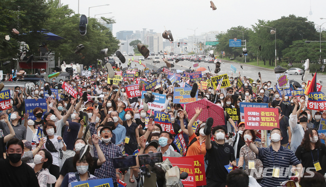[서울=뉴시스]김명원 기자 = 6·17 대책 피해자 모임 등 참석 시민들이 1일 서울 영등포구 여의대로에서 열린 부동산 대책 관련 정부 규탄 집회에 신발 던지는 퍼포먼스를 하고 있다. 2020.08.01.