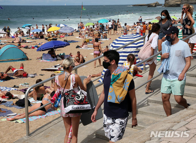 [비아리츠=AP/뉴시스]3일(현지시간) 프랑스 비아리츠의 해변에서 사람들이 코로나19 확산 예방을 위해 마스크를 쓰고 다니고 있다. 프랑스 여러 지역에서 최근 야외 마스크 착용이 요구되면서 사람들이 마스크를 착용하고 있다. 프랑스 서부 마옌느 지역 69개 타운도 북부 도시 릴과 해안 도시 비아리츠와 마찬가지로 야외 공공장소 마스크 착용을 의무화했다. 2020.08.04.