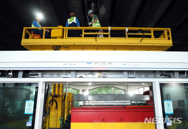 [서울=뉴시스] 이윤청 기자 = 5일 오전 5시께 수도권 전철 1호선 신이문역 고가차도에서 외부 시설물이 떨어져 광운대역-회기역 구간 양방향 열차 운행이 일시 중단됐다. 코레일 시설 복구 작업반이 5일 서울 동대문구 신이문역에서 복구작업을 하고 있다. 2020.08.05.