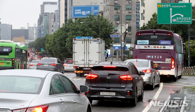 [서울=뉴시스] 조수정 기자 = 폭우로 인한 침수 우려로 동부간선도로·강변북로·내부순환로·올림픽대로 등 곳곳이 통제된 6일 서울 광진구 군자교 인근에서 동부간선도로 대신 우회로를 이용하는 차량들이 정체를 빚고 있다. 2020.08.06.
