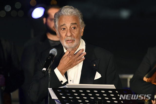 [잘츠부르크=AP/뉴시스]테너 플라시도 도밍고가 6일(현지시간) 오스트리아 잘츠부르크에서 열린 오스트리아 음악상 시상식에서 평생공로상을 받으며 소감을 전하고 있다. 도밍고는 지난 3월 코로나19 확진 판정을 받았다가 완치했으며 이탈리아에서 공연할 계획이다. 2020.08.07.