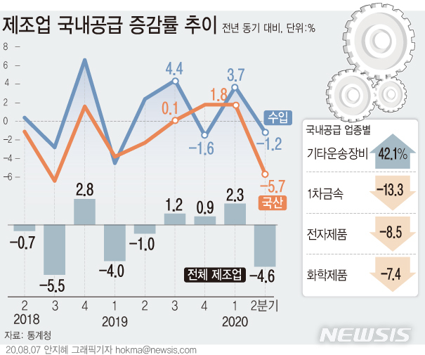 [서울=뉴시스]7일 통계청에 따르면 내수시장 동향을 보여주는 제조업 국내공급지수는 101.3(2015년=100)로 1년 전보다 4.6% 감소했다. 2018년 3분기(-5.5%) 이래 가장 큰 감소폭이다. (그래픽=안지혜 기자)