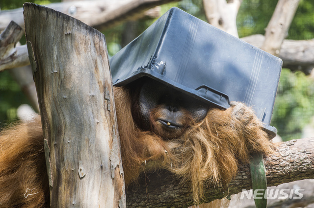 [부다페스트=AP/뉴시스]6일(현지시간) 헝가리 부다페스트의 부다페스트 동·식물원에서 오랑우탄 한 마리가 상자를 머리에 쓰고 쉬고 있다. 이 동물원은 오는 9일 개관 154주년을 맞는다. 2020.08.07.