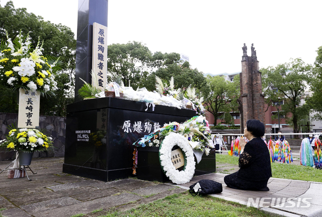 [나가사키=AP/뉴시스]나가사키 원폭 투하 75주년인 9일 일본 남부 나가사키의 원자폭탄 폭심지 공원에서 한 유족이 원폭 희생자들을 위해 기도하고 있다. 2020.08.09.