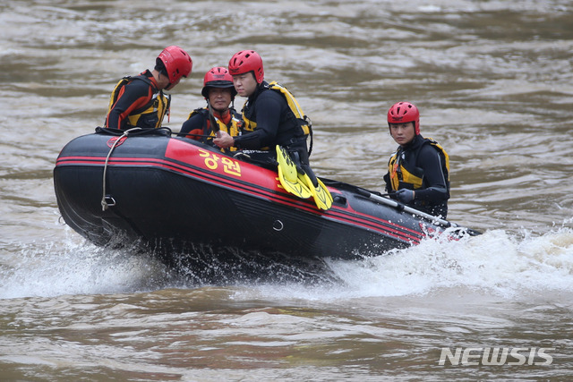 [춘천=뉴시스] 김경목 기자 = 9일 오후 강원도소방본부 특수구조단·환동해특수재난대응단 구조대원들이 강원 춘천시 서면 의암댐 하류에서 발견되지 않는 실종자 3명을 찾기 위한 수색을 하고 있다. 2020.08.09.