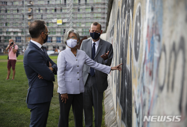 [베를린=AP/뉴시스] 독일을 방문 중인인 강경화 외무장관이 10일 베를린 장벽 잔존유적지를 찾아 하이코 마스 외무장관(왼쪽)과 이야기를 나누고 있다. 뒤쪽은 사적지 관리소장이며 베를린 장벽은 냉전와해의 급격한 상황 전개 속에 1989년 무너져 통독의 물꼬를 텄다. 2010. 8. 10.