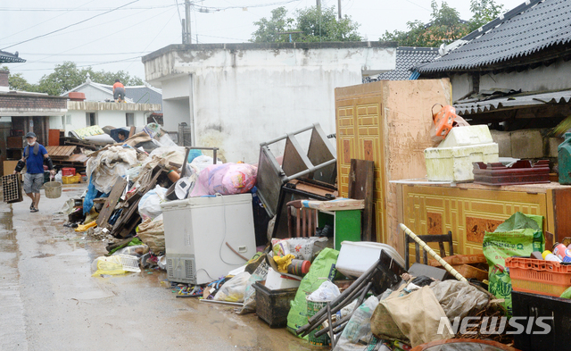 [남원=뉴시스] 김얼 기자 = 지난 8일 몰아친 집중호우로 마을 전체가 침수 피해를 입은 전북 남원시 금지면 귀석리 마을의 물이 빠져나간 10일 마을 어귀에 쓰지 못하게 된 가재도구들이 널브러져 있다. 2020.08.10.
