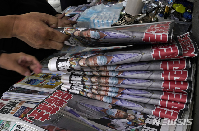 [홍콩=AP/뉴시스]11일 홍콩의 한 신문 가판대에 홍콩의 대표 반중(反中) 매체 빈과일보가 진열돼 있다. 이 신문 1면에는 사주인 지미 라이가 전날 국가보안법 위반 혐의로 체포되는 모습이 실려 있다. 경찰은 지미 라이 체포에 이어 빈과일보 사옥도 압수 수색을 해 새로운 보안법 시행을 확대하고 반중 언론에 대한 압박을 높이며 언론의 자유에 대한 두려움을 높였다. 2020.08.11.