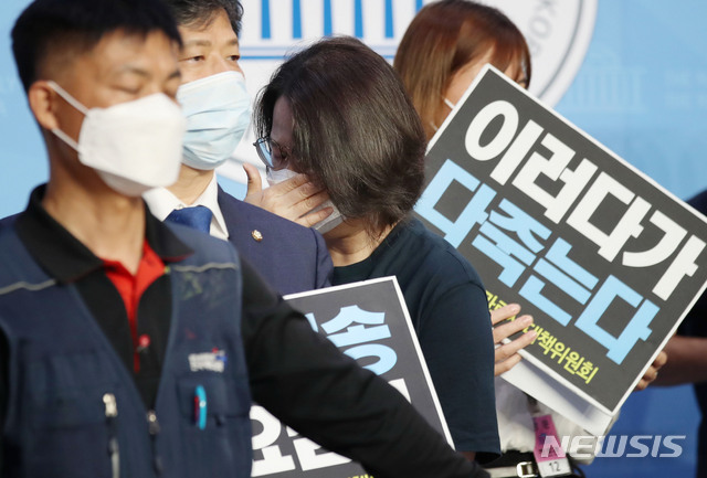 [서울=뉴시스] 김진아 기자 = CJ대한통운 고 서형욱 택배노동자 유가족인 서형주 씨가 11일 서울 여의도 국회 소통관에서 열린 택배노동자 과로사 대책 마련 촉구 유가족 공동 기자회견에서 발언 후 눈물을 흘리고 있다. 2020.08.11.
