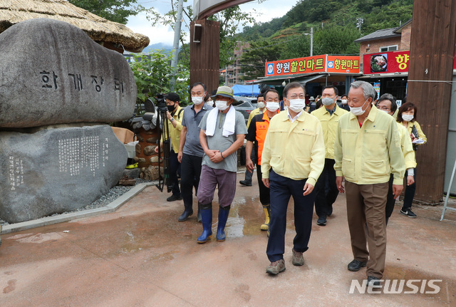 [하동=뉴시스]배훈식 기자 = 집중호우 피해현장 방문에 나선 문재인 대통령이 12일 경남 하동군 화개장터를 찾아 피해현장을 둘러보고 있다. 2020.08.12.