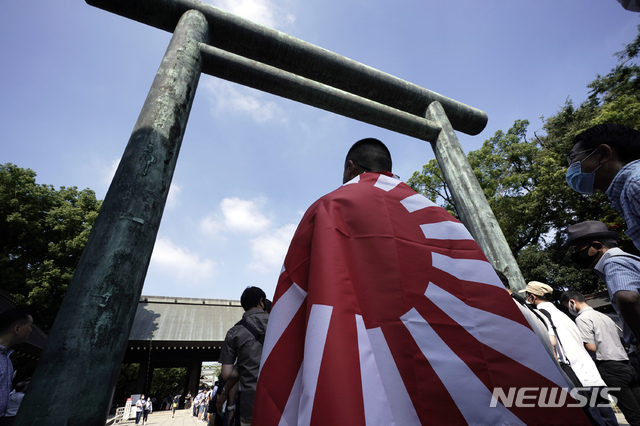 [도쿄=AP/뉴시스]태평양전쟁 패전 75주년을 맞은 15일 일본 도쿄의 야스쿠니 신사에서 한 남성이 욱일기를 몸에 두르고 참배 순서를 기다리고 있다. 아베 신조 일본 총리는 야스쿠니 신사에 참배하진 않았으나 공물을 바친 것으로 알려졌다. 2020.08.15.