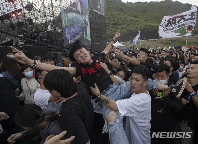 [충리=AP/뉴시스]15일(현지시간) 중국 북부 허베이성 충리에서 '헬로 충리-타이우' 미디 음악 행사가 열려 행사장에 몰린 참석자들이 뒤엉켜 즐기고 있다. 중국에서 해외 여행객들로부터 코로나19 확진 사례가 늘어나는 가운데 대규모 행사가 재개되고 있다. 2020.08.16.