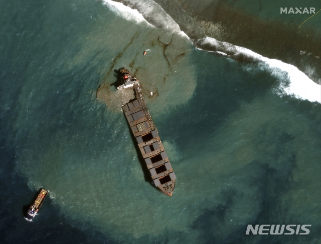 [포트루이스=AP/뉴시스]맥사 테크놀로지가 18일(현지시간) 제공한 위성사진에 모리셔스 동남쪽 해안에서 좌초된 두 동강 난 일본 선박 와카시오호(MV)의 모습이 보인다. 모리셔스 경찰은 인도양 섬나라 모리셔스에서 좌초한 와카시오호 선장 수닐 쿠마르 난데슈와르와 부선장 등 2명을 항해 안전을 위협한 혐의로 체포했다고 밝혔다. 선장은 모리셔스 해안경비대의 ‘좌초 위험 경고'를 무시한 혐의를 받고 있다. 2020.08.19.