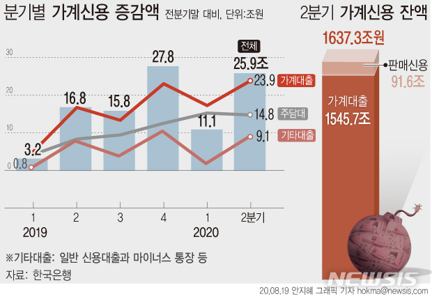 [서울=뉴시스]19일 한국은행에 따르면 2분기 가계신용 잔액은 1637조3000억원으로 전기대비 23조9000억원(1.6%) 증가했다. 일반 신용대출과 마이너스 통장 등 기타대출은 9조1000억원 급증했다. (그래픽=안지혜 기자)